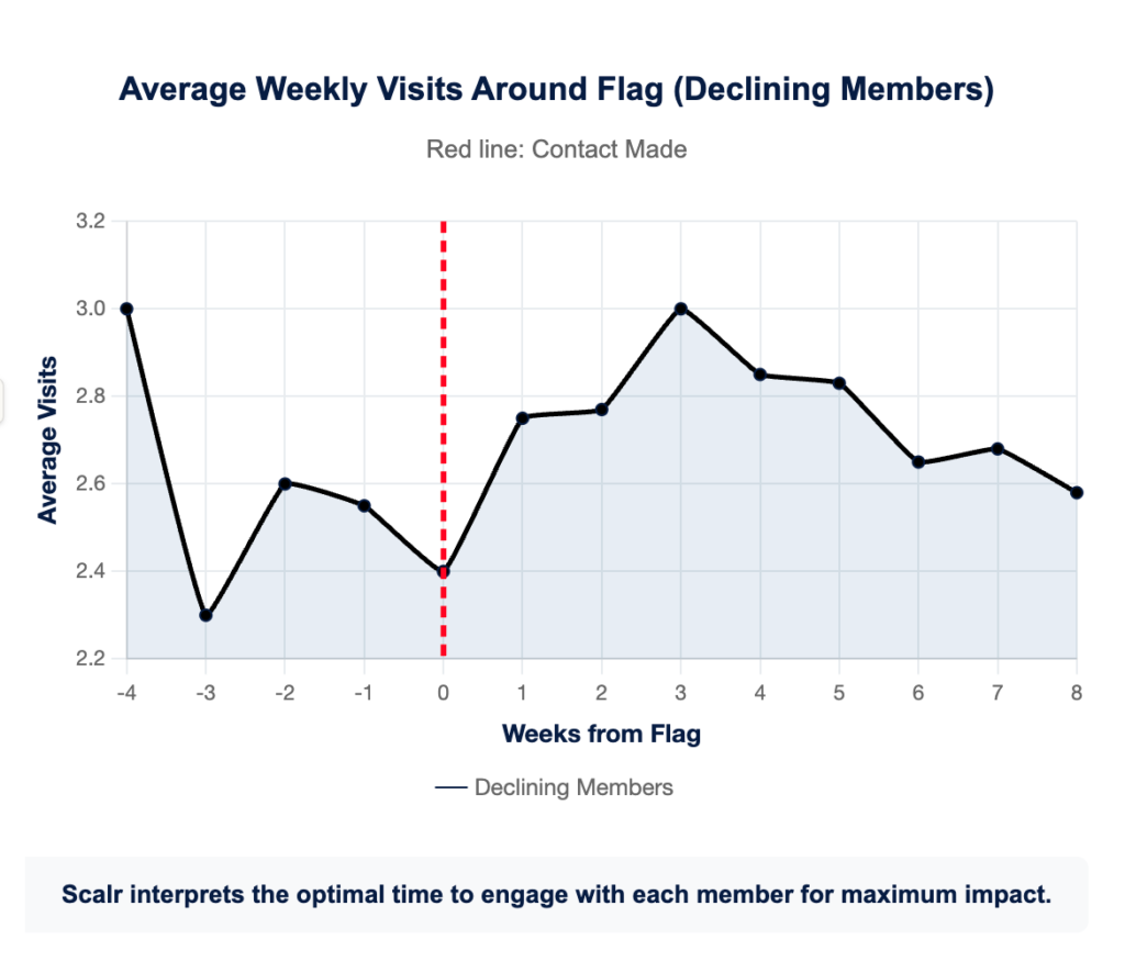 The key to these results? Optimal timing. Scalr interprets the precise moment to engage with each member for maximum impact, whether they’re showing signs of declining visits, consistency breaks, or schedule shifts.
