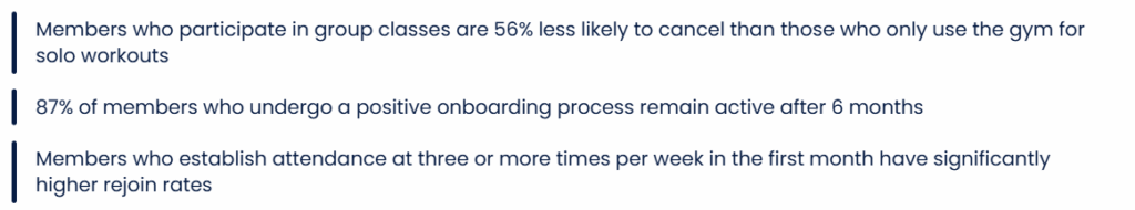 The first 90 days are critical: 80% of members who attend the gym less than once per week in the first month will cancel within six months.